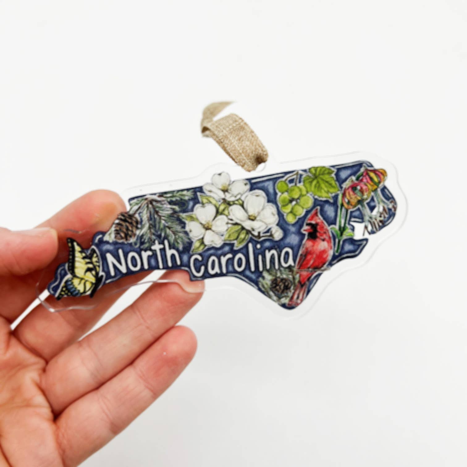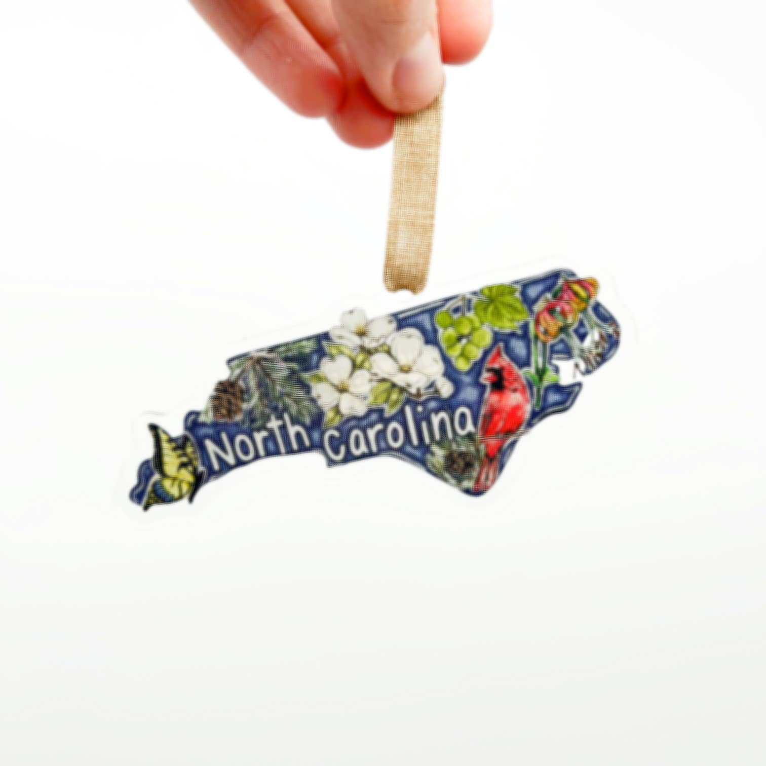 Celebrate your pride for the state of North Carolina with this charming ornament design that features all of The Tar Heel State's iconic favorites: the red cardinal, the dogwood flower, the fraser fir, the scuppernong grape, the Carolina lily, and the majestic eastern tiger swallowtail butterfly.