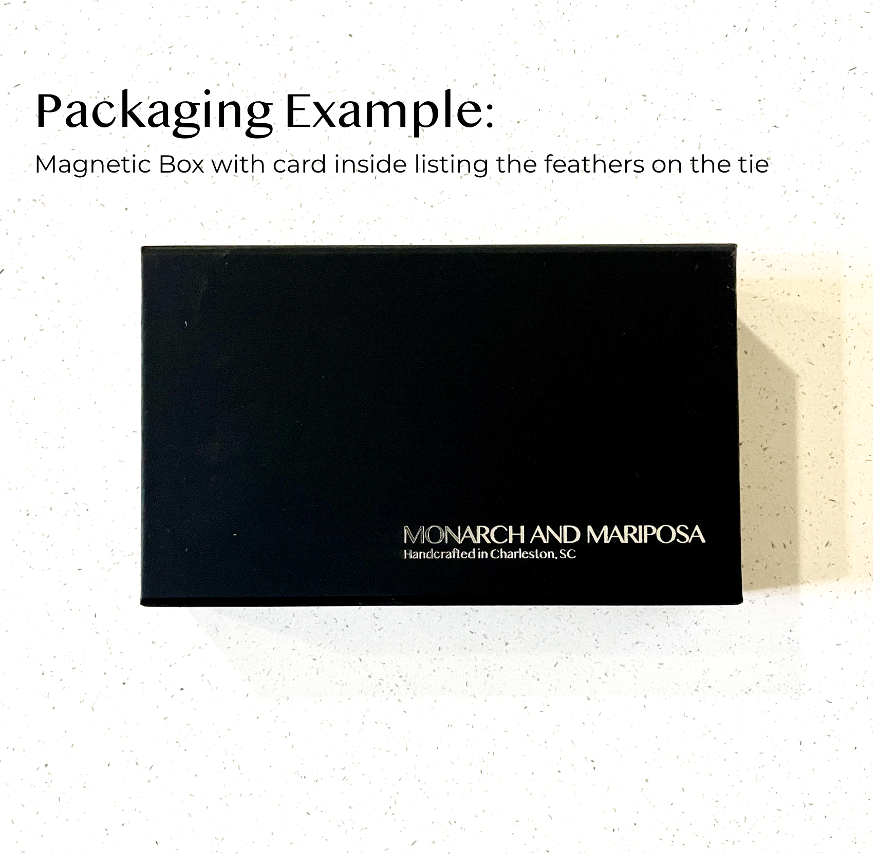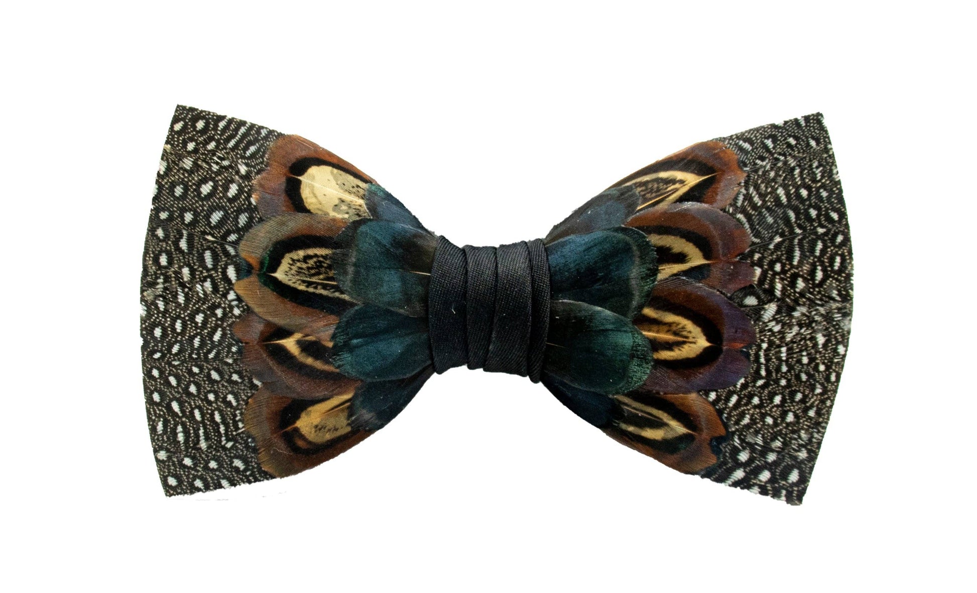 This tie is handcrafted from Guinea Hen and Pheasant feathers Pre-tied with an adjustable neck strap Bow tie is about 4.5 inches wide and 2.25 inches tall prom, graduation, fathers day, easter.